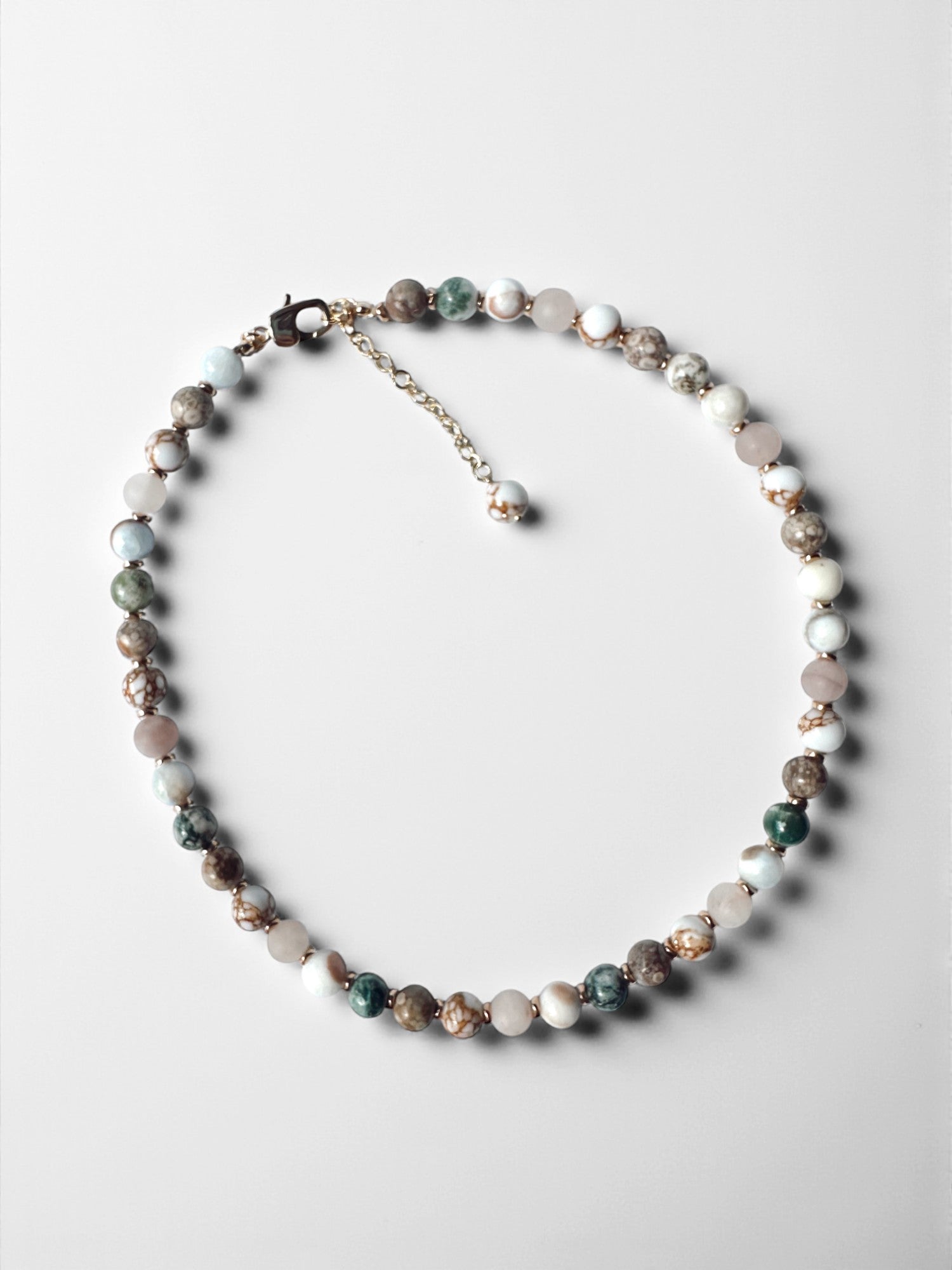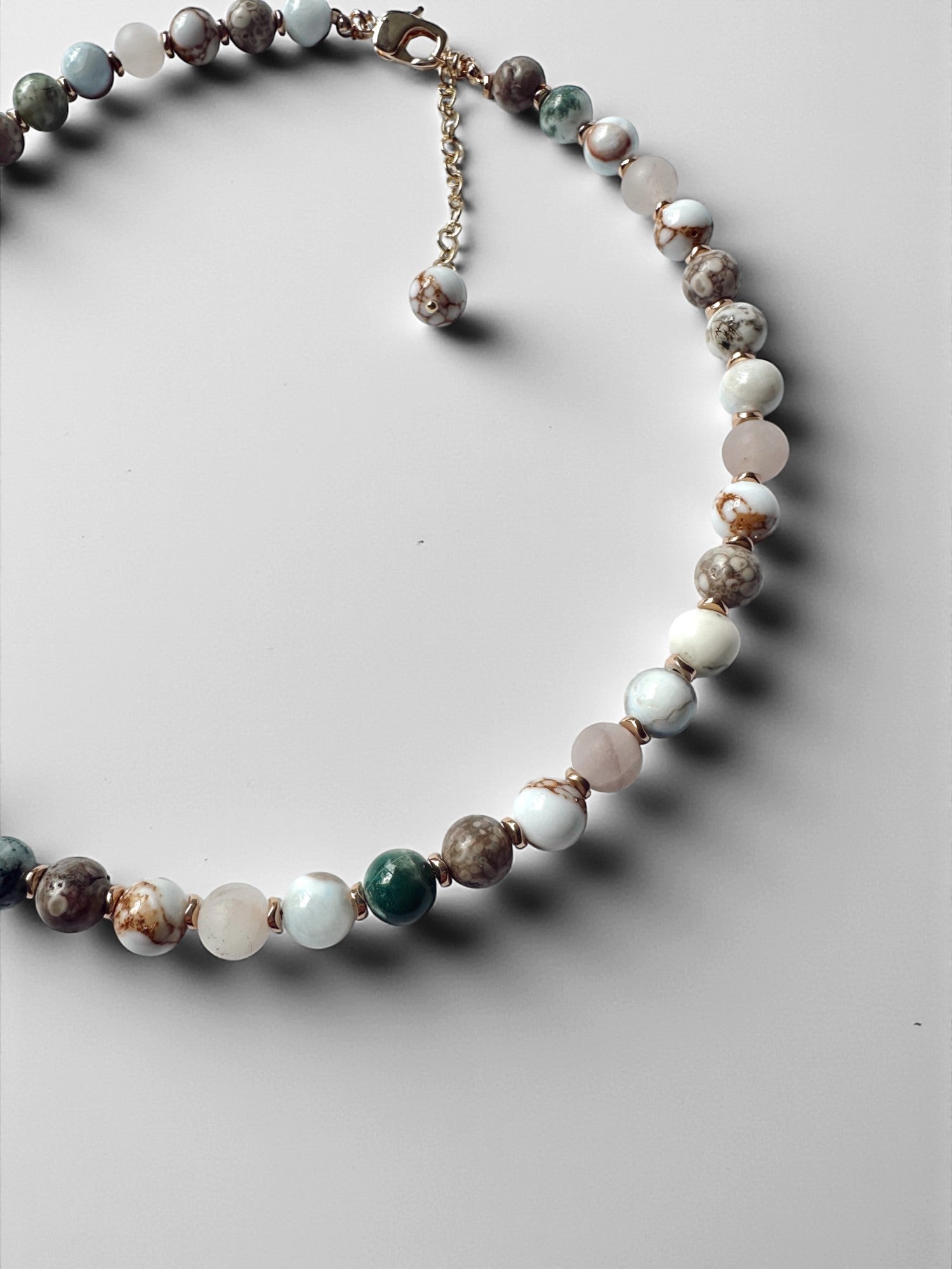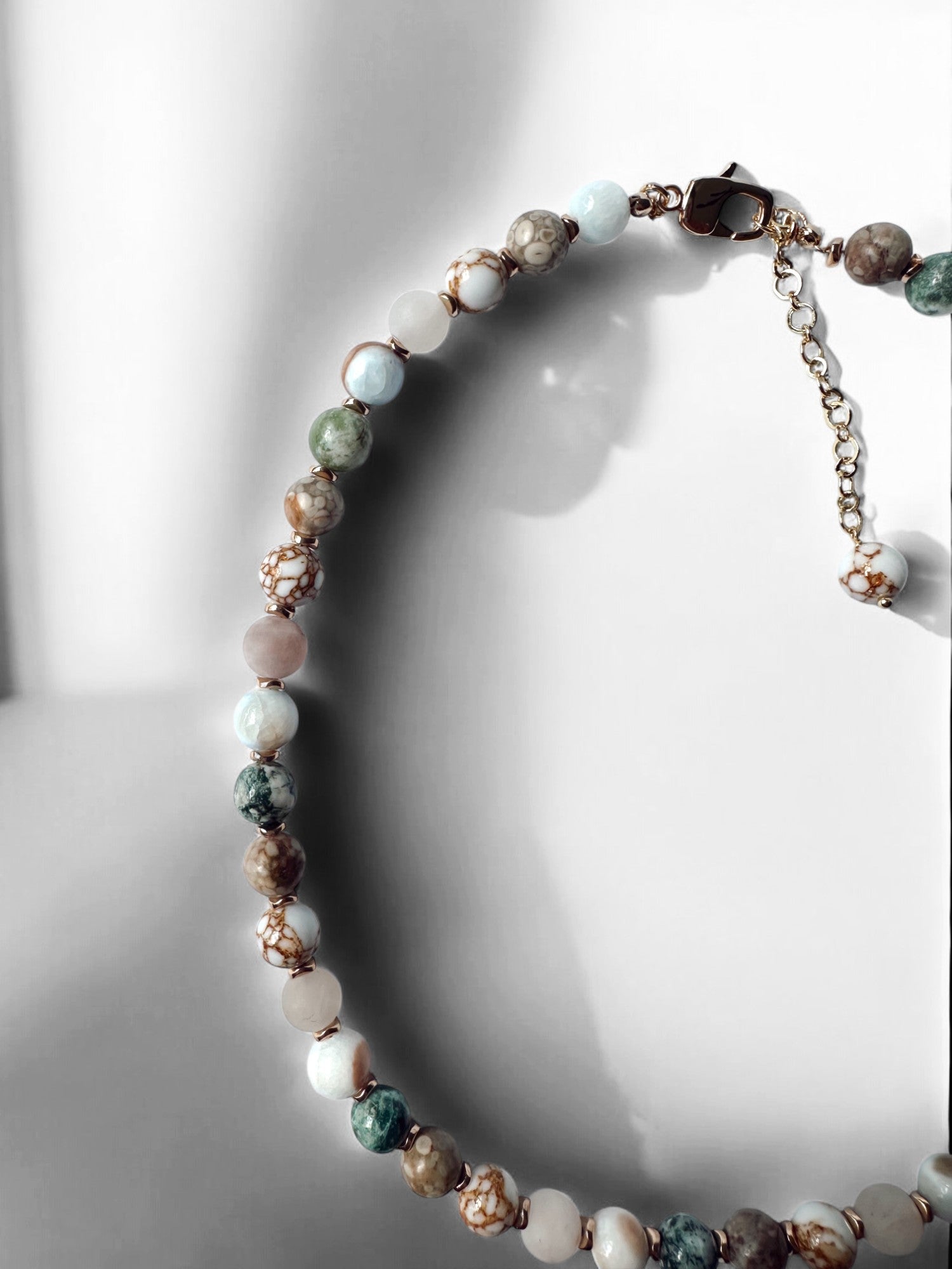 This elegant necklace features 14kt gold fastenings and a beautiful combination of natural stone beads spaced with gold hematite beads. The design creates a stunning contrast between the natural textures of the beads and the luxurious gold.